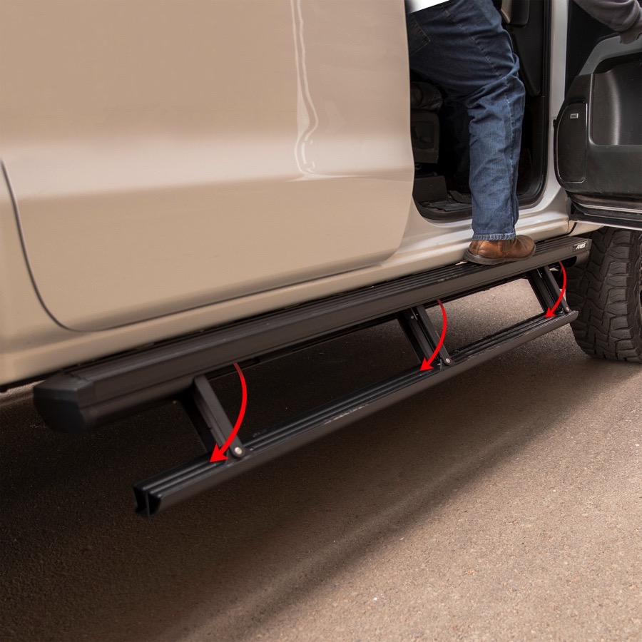 Gain as much as a 15-inch drop below your doorsill with each anti-slip step. All the electronic components, including the rotary motor, are protected from dust, moisture and mud inside a secure housing. The drill-free installation uses the pre-fabricated holes in your frame to quickly bolt on each running board. Quickly plug in the mechanism to your vehicle battery, and you're ready to hit the ground running.