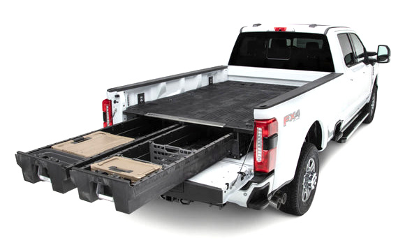 Your DECKED storage system is a heavy-duty, weathertight, and secure system for organizing and storing your gear. It contains two spacious, waist-level drawers that boast a 200-pound weight capacity, making it convenient to access and simple to use. Additional organizational options included in the basic system are a D-Box, a Crossbox, a Drawerganizer, and locking drawer dividers. With the addition of the Drawer Drain Plug, you can convert one drawer into a mobile ice chest, which is ideal for tailgating.