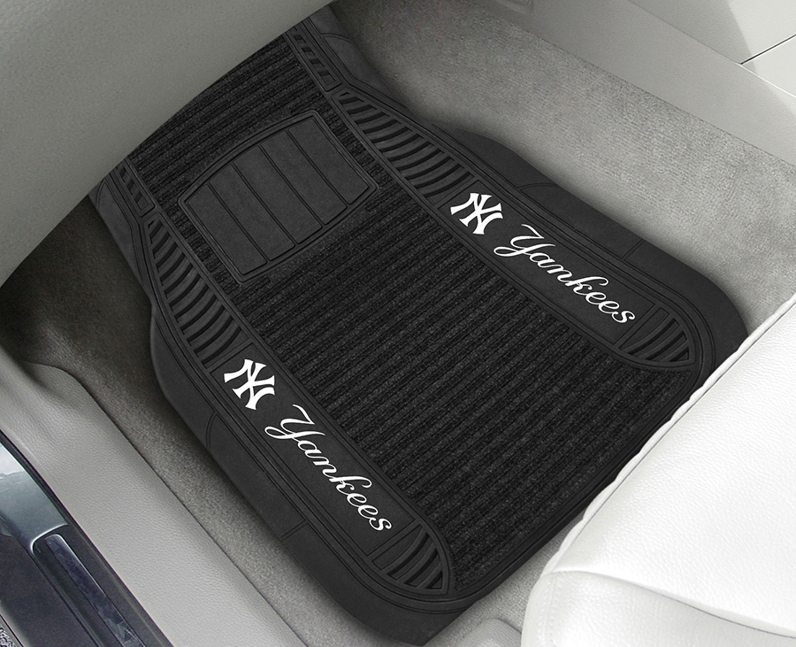 Guard your factory-installed, original interior carpeting against stains and stress with the strongly constructed, dual-ribbed charcoal carpet of Fanmats Deluxe Floor Mats. Sunken channels divert runoff from your boots and sneakers. Mimicking the security of cleats, the underside of your MLB Team Mats are lined with nibs to give you solid footing.