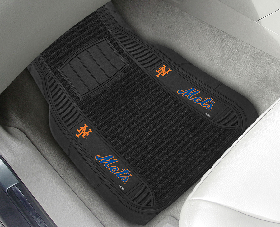Guard your factory-installed, original interior carpeting against stains and stress with the strongly constructed, dual-ribbed charcoal carpet of Fanmats Deluxe Floor Mats. Sunken channels divert runoff from your boots and sneakers. Mimicking the security of cleats, the underside of your MLB Team Mats are lined with nibs to give you solid footing.
