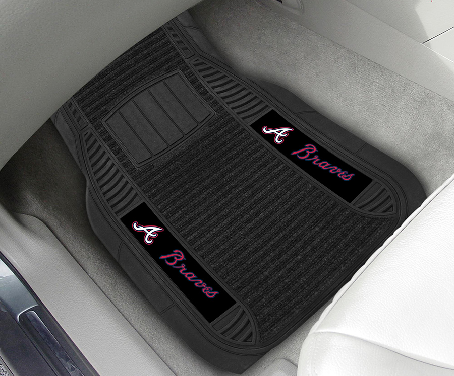 Guard your factory-installed, original interior carpeting against stains and stress with the strongly constructed, dual-ribbed charcoal carpet of Fanmats Deluxe Floor Mats. Sunken channels divert runoff from your boots and sneakers. Mimicking the security of cleats, the underside of your MLB Team Mats are lined with nibs to give you solid footing.
