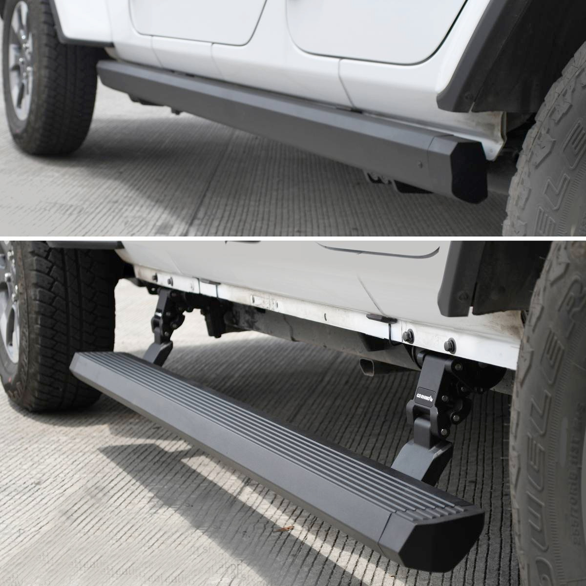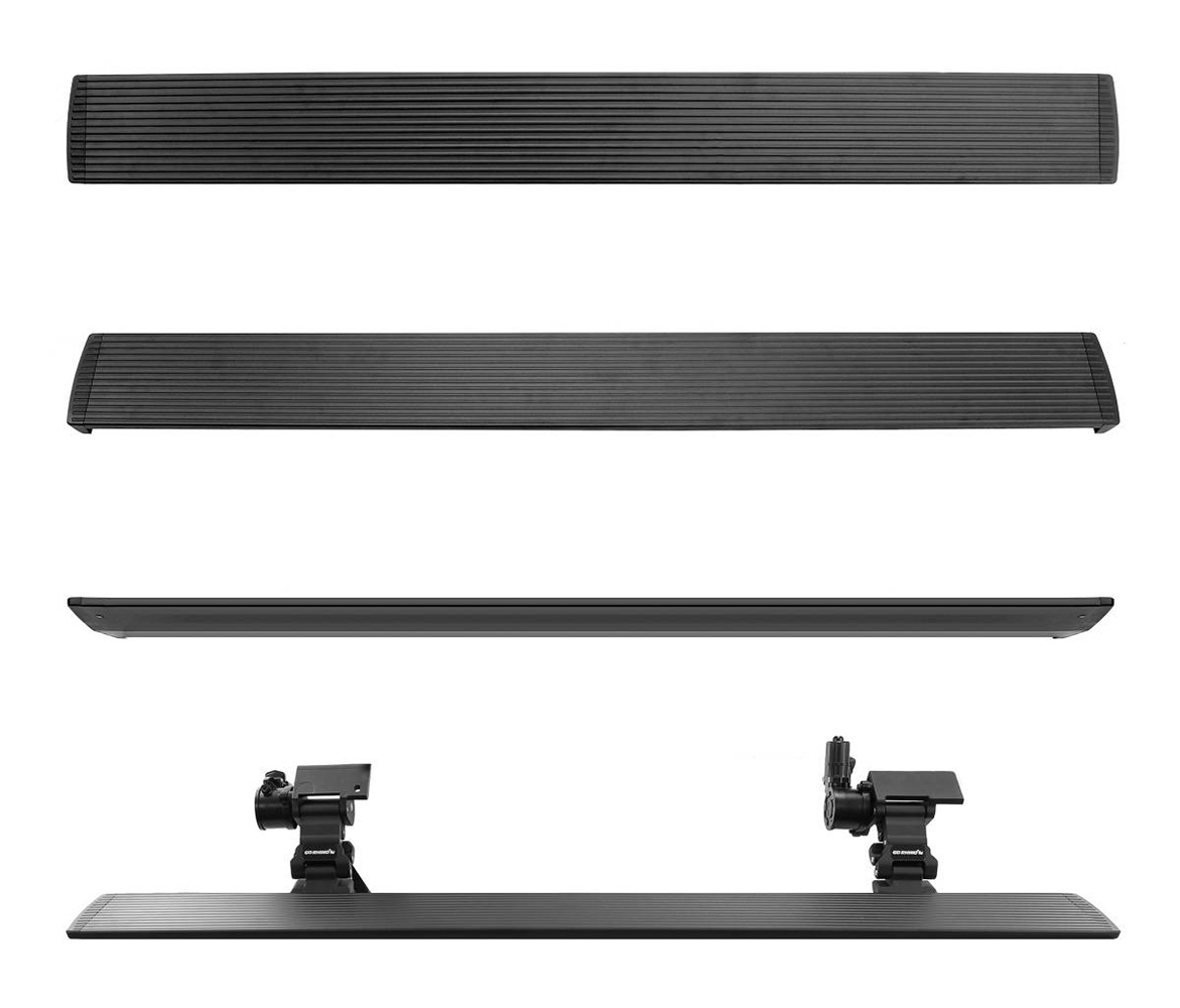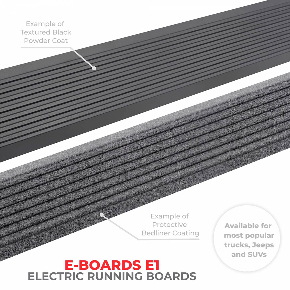 A strong side-step will greatly improve how you use your vehicle, whether it's a truck, Jeep or SUV; safely stepping into your vehicle is paramount when you are in a hurry or if you need help effortlessly getting inside your cab. The fashionable Go Rhino E-BOARD E1 Electric Running Boards mechanically ejects when you open your door and withdraw when the door is closed.