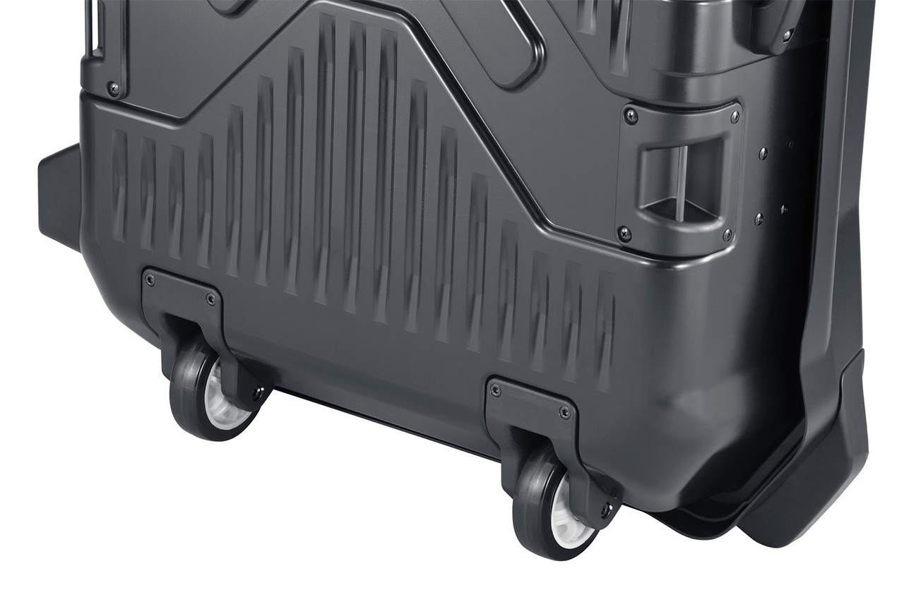 - Includes 2 wheels and a handle that can be tucked away