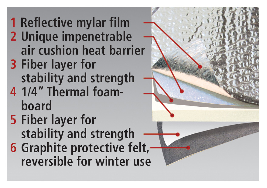 This sunshade is custom-made to fit your vehicle exactly. A highly insulated, six-layer design features graphite felt, thermal foam board, two layers of fiber, air cushions, and finally mylar. A storage bag is also included to keep your shade from cluttering your space when not in use. Backed by a Lifetime Warranty.