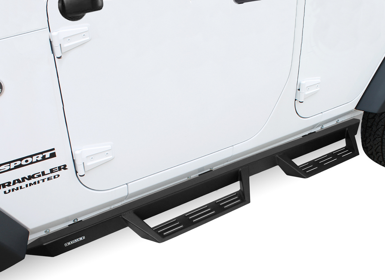 Just as strong as they are fashionable, your Magnum RT Step Bars are constructed from cold-rolled 14-gauge steel. Underneath each of your doors is a gripping diamond-tread step pad that you and your passengers can use with confidence. You'll also be confident in the long-lasting look of your Gen 2 Steps thanks to the rust-fighting, three-stage black powder coat.