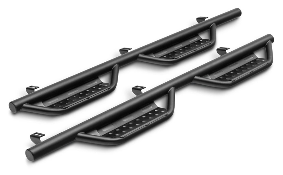 Your new nerf steps are made to accommodate wider footing with their extended width. The 5-inch step surface and 2-inch tubing make for a durable, roomy sidestep that'll complement any modern truck. The bars run parallel to the side of your cab for a sporty, aerodynamic feel while the steps themselves jut out for easy access and extra scuff protection. Conveniently located at every door, these drop-down steps feature SureGrip plates for maximum grip, even when it's cold and rainy.