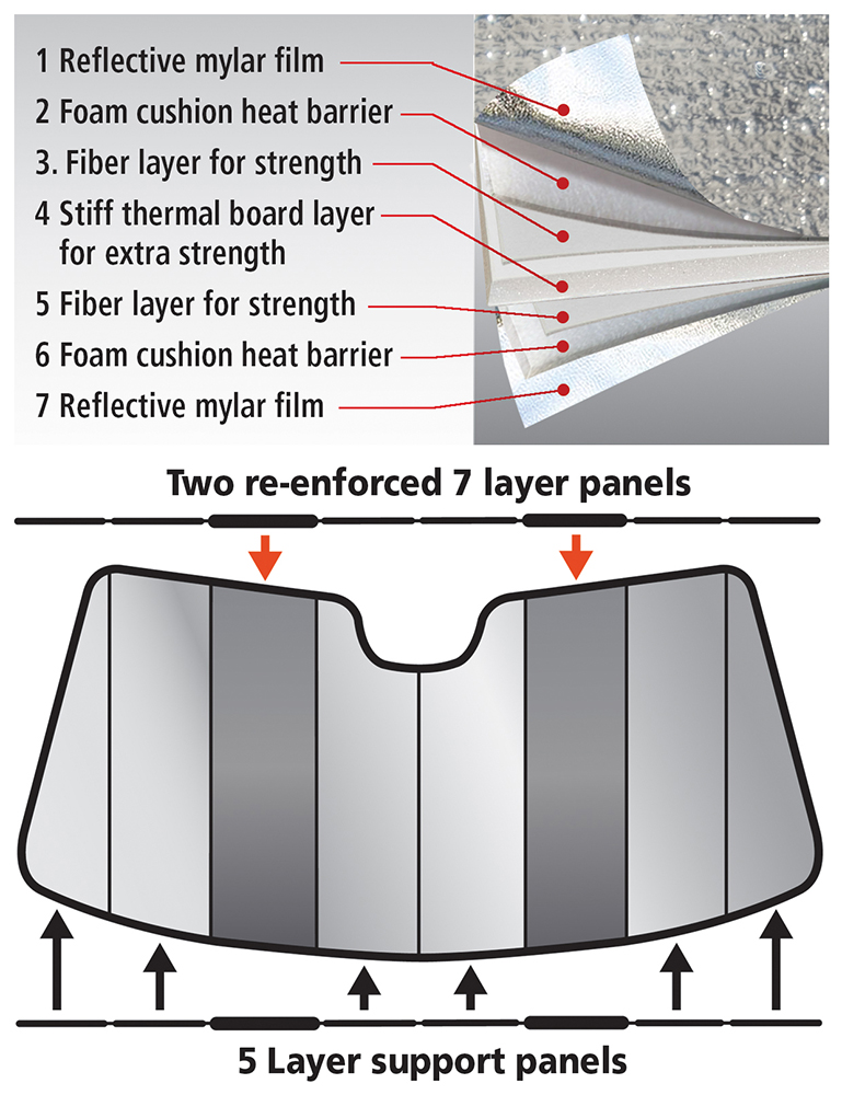 An advanced, seven-layer design efficiently reflects sun rays away from the windshield. The premium sunshade is strong enough to stand upright on its own for long periods of time, but smooth enough that the soft mylar material is gentle on your dash and seat interiors as it slides in and out of position. Because this sunshade is custom-made for your specific make and model, it will fit right into place. All you have to do is lower your sun visors to hold this shade against your windshield.