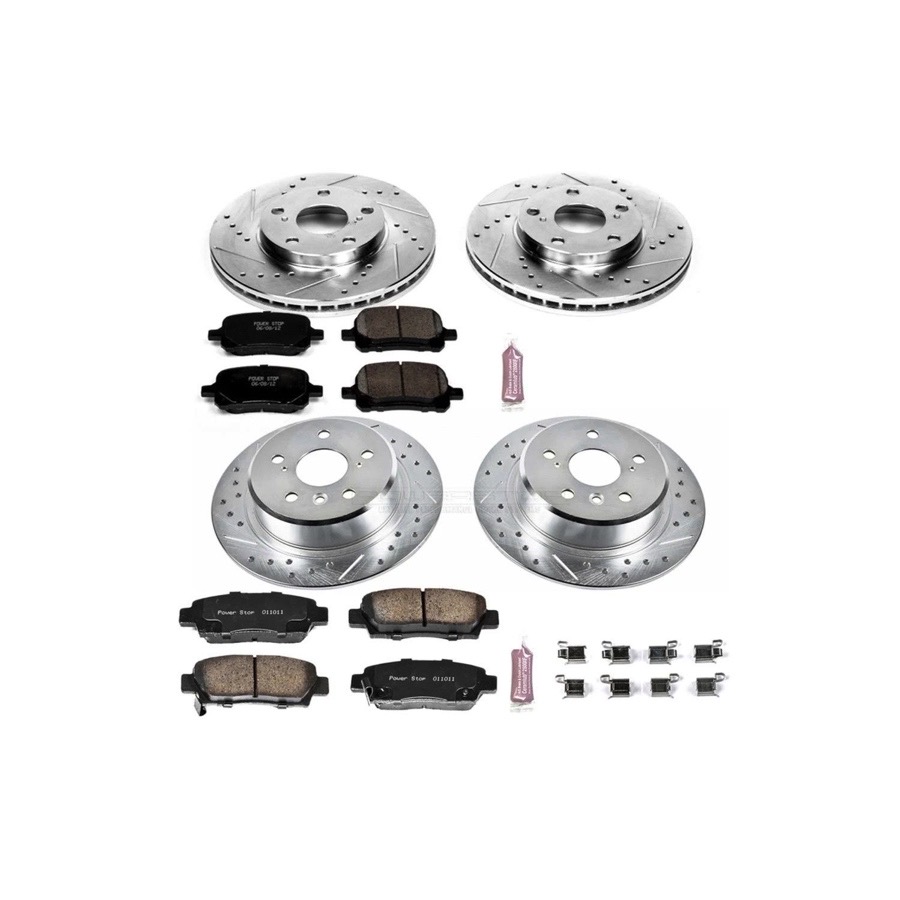 - Contains Power Stop Z23 Evolution Sport Ceramic Brake Pads to pair with Cross Drilled/Slotted Rotors that expertly dispel gases, hot air and brake dust