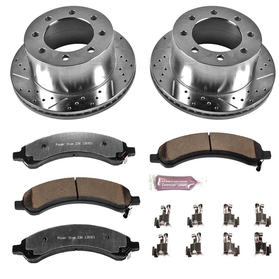 Your Power Stop Truck & Tow Brake Kit includes Z36 metallic brake pads and Power Stop cross-drilled and slotted rotors. This performance brake package was specially created to improve the performance of your large vehicle, and it can enhance stopping power by as much as 17%. The included rotors have been drilled and slotted to dissipate heat and lessen brake fade. These advanced rotors also sweep clear brake dust for a better initial bite between the surface of the rotor and your heavy-duty carbon ceramic brake pads. Each kit installs easily and provides your truck or SUV with a straight OEM-style fit with optimum function.