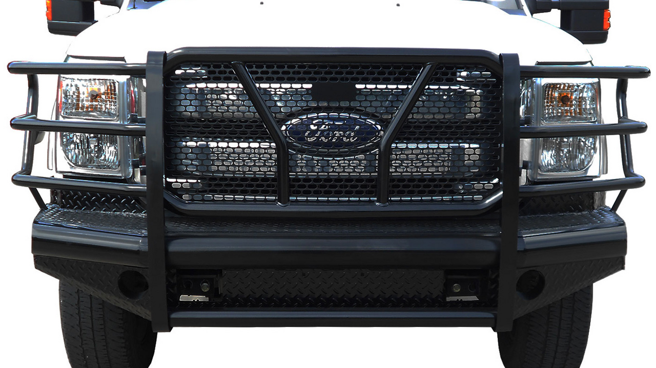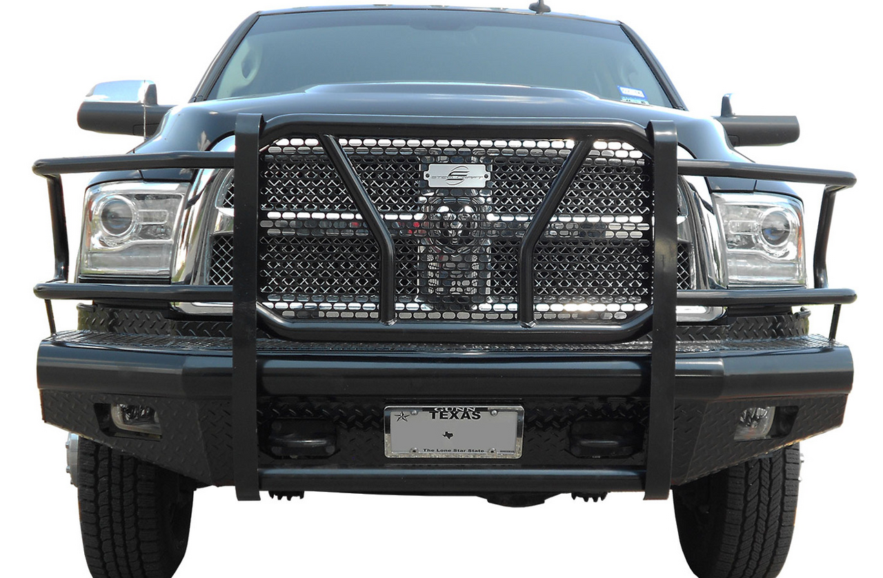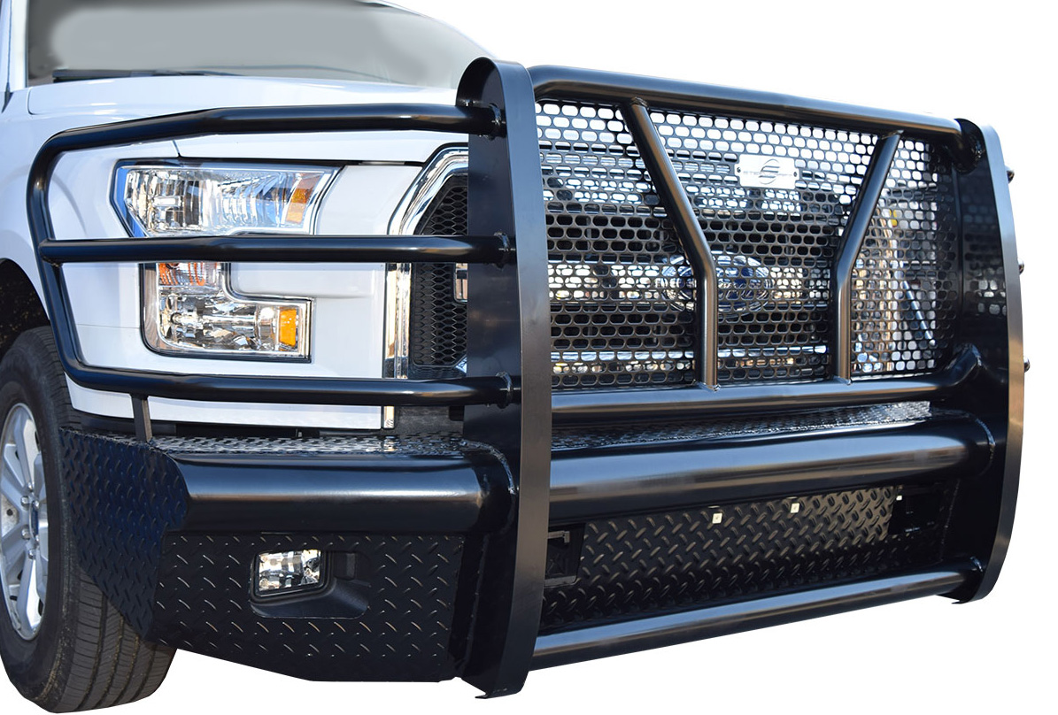 This bumper-grille combo is fabricated from a high-quality punch plate, not expanded metal mesh-like other manufacturers offer, and it allows your to retain the access to tow hooks and fog lights you depend on. Your Steelcraft Bumper is electrocoated, which means every inch of the steel is bonded to a protective layer. It's then coated with a black-powder, semi-gloss finish.
