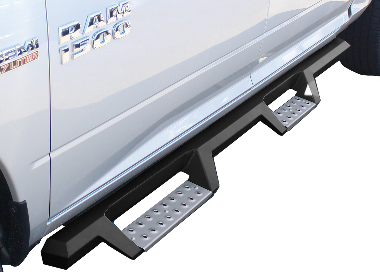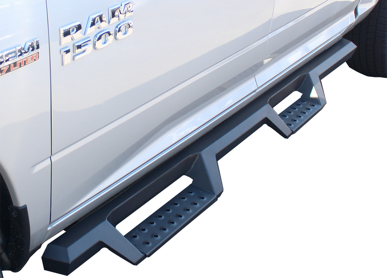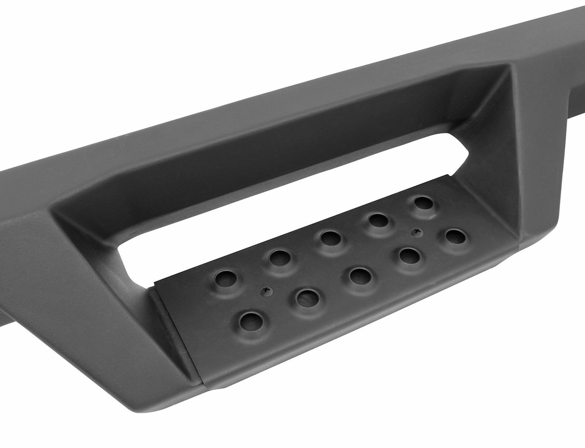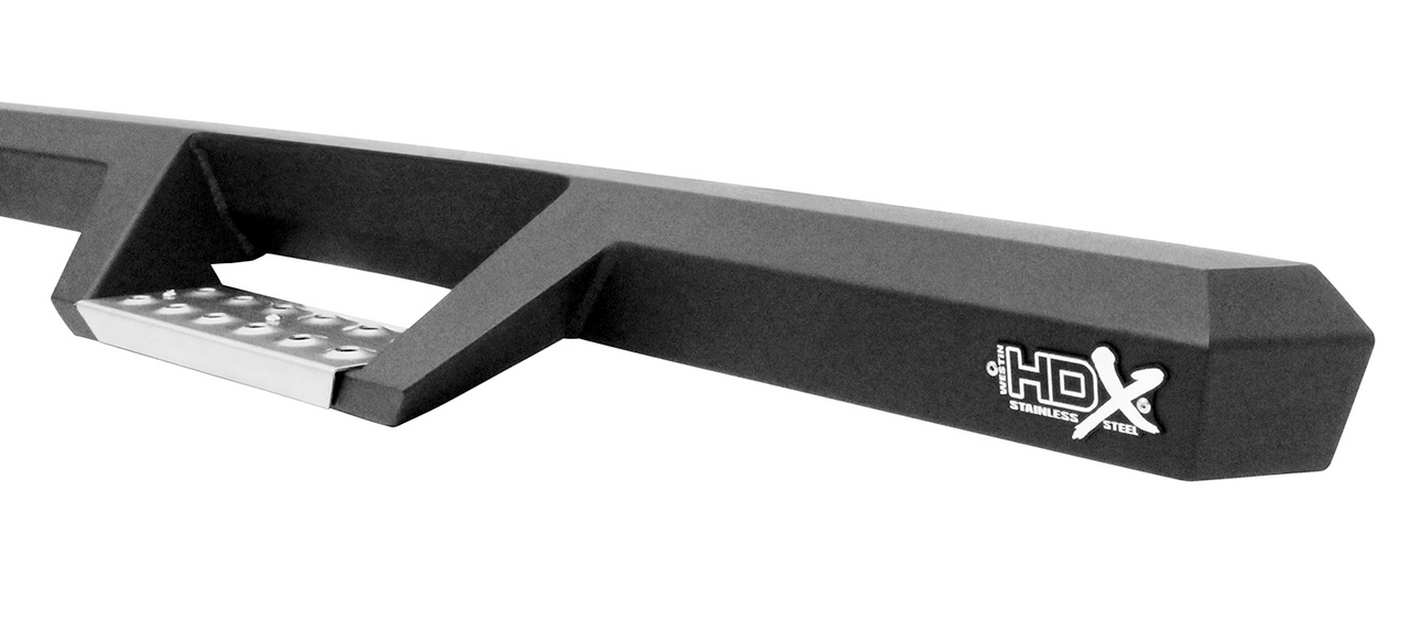 The all stainless steel, one-piece fabrication is finished off with a handsome textured black powder coat to prevent corrosion from wet or salty conditions. Die stamped step pads increase gripping traction, and any muck from your boots can be easily removed with a thorough cleaning. Select either matte black or stainless steel for your step areas, and choose from Cab-Length or Wheel-to-Wheel with a third step for improved truck bed access.